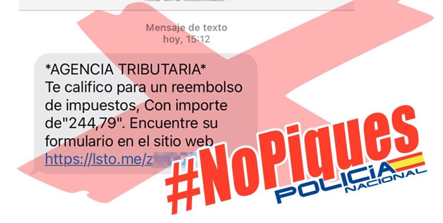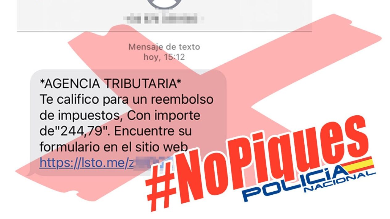 "Agencia Tributaria. Te califico para un reembolso de impuestos, con un importe de 244,79 euros. Encuentro su formulario en el sitio web". Este es el mensaje que la Policía ha compartido en sus redes sociales como ejemplo de lo que puede estar comenzándole a llegar a algunos usuarios.