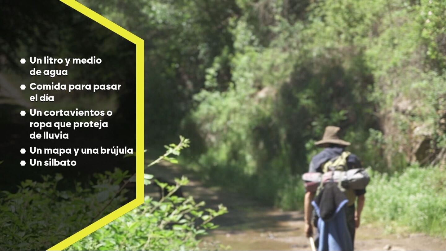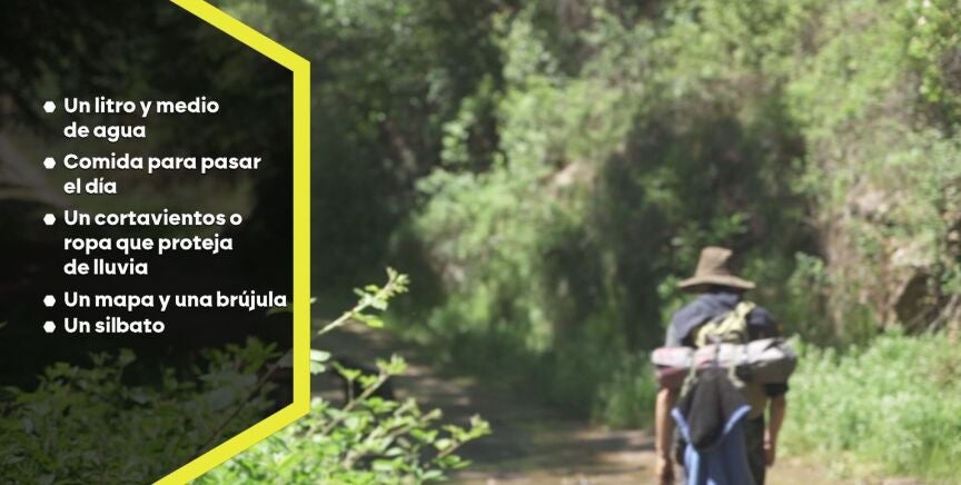 El equipamiento básico que hay que meter en la mochila es de un litro y medio de agua por persona, algo de comida para pasar el día, un cortavientos, algo con lo que poder taparnos el cuello y también una gorra, tanto por el día por el sol como por la noche por el frío para mantener el calor en la cabeza. También unas botas de montaña, con calcetines cómodos y ropa cómoda. Y sí, también un silbato por si hay que pedir ayuda, además de un mapa o una brújula que sirva como método de orientación.