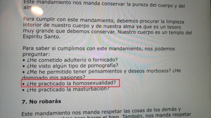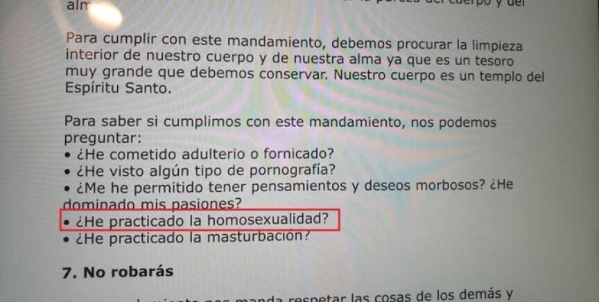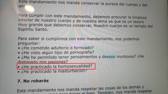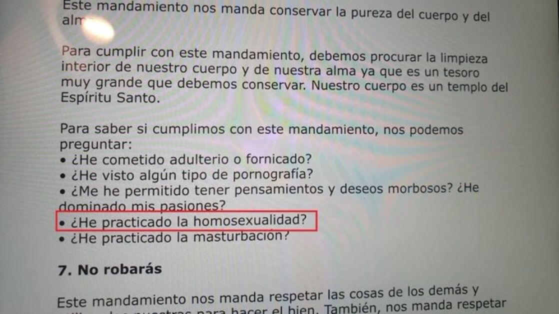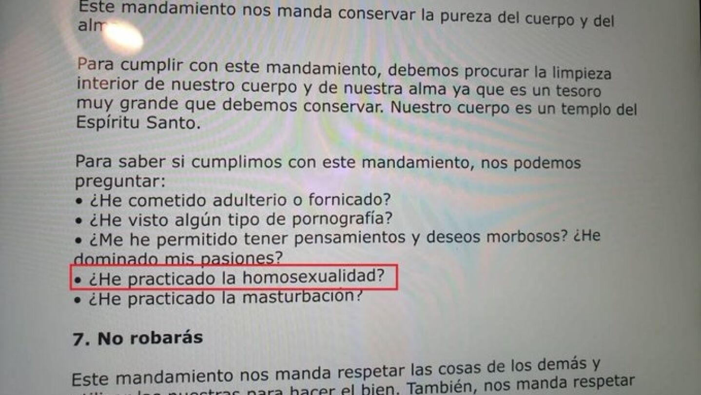 En ese cuestionario, difundido a través de redes sociales, se asegura que el Sexto Mandamiento "manda conservar la pureza del cuerpo y el alma" y añade que "para saber si cumplimos con ese mandamiento, nos podemos preguntar: