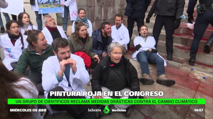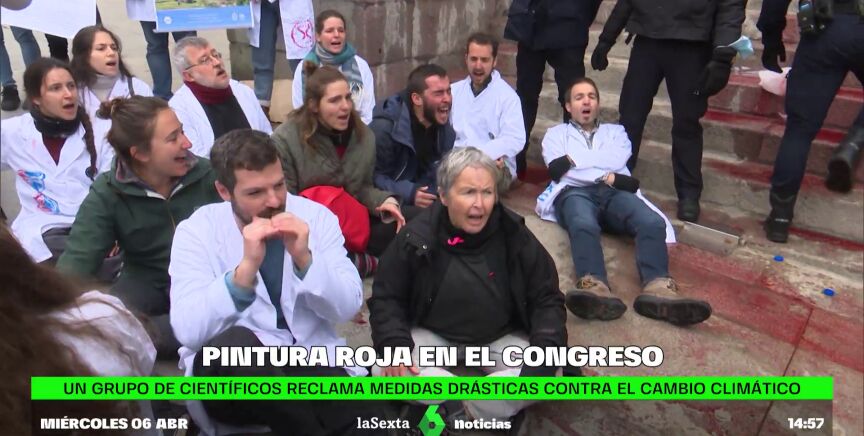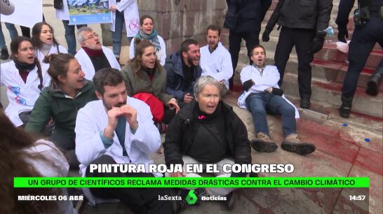 Desde el colectivo Rebelión Científica reclaman medidas urgentes para frenar la catástrofe medioambiental. Medio centenar de personas se han concentrado este miércoles frente a la escalinata del Congreso y han manchado con tinta roja biodegradable la fachada de los Leones en respuesta a la pasividad del Gobierno ante la crisis climática y en contra de una ley que consideran insuficiente.