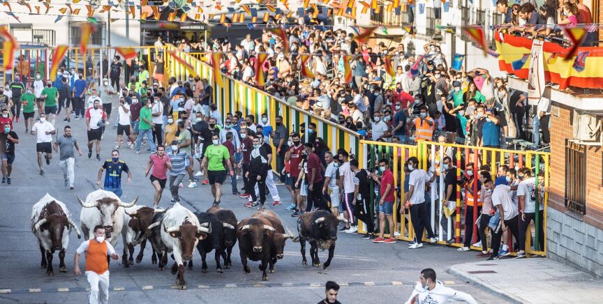Ni Pamplona, ni San Sebastián de los Reyes, el primer encierro post pandemia de España se ha corrido en Villaseca de la Sagra (Toledo). Un total de diez toros han corrido por las calles del pueblo de apenas 2.000 habitantes.