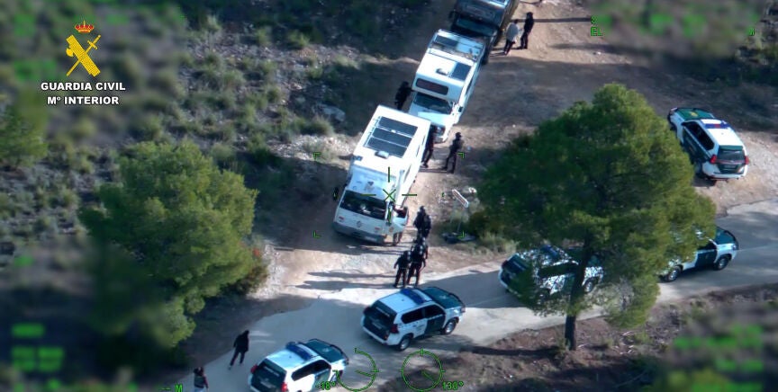 Los detalles Los agentes también han intervenido 16 vehículos pesados, entre camiones y furgones en los que se transportaba el material necesario para establecer la infraestructura de soporte de la fiesta ilegal.