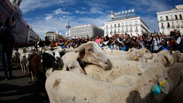 El centro de la capital ha colapsado este mediodía con el paso de las ovejas y sus pastores ataviados con trajes típicos. Las ovejas, guiadas por la Fundación Trashumancia y Naturaleza, salieron a las 10:00 horas de la Casa de Campo para realizar el itinerario tradicional con llegada a Cibeles en torno a las 13:00 horas.
