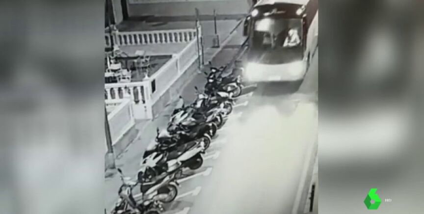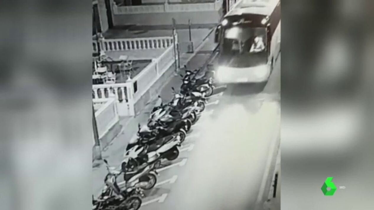 Un hombre que conducía un autobús robado ha sido detenido en Benidorm tras destrozar varios coches y motos que se encontraban aparcados en el centro de la ciudad. El momento fue captado por una cámara de seguridad, como puede verse en el vídeo que acompaña estas líneas.