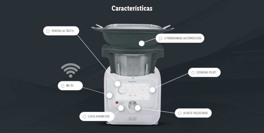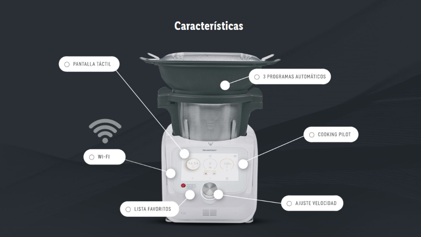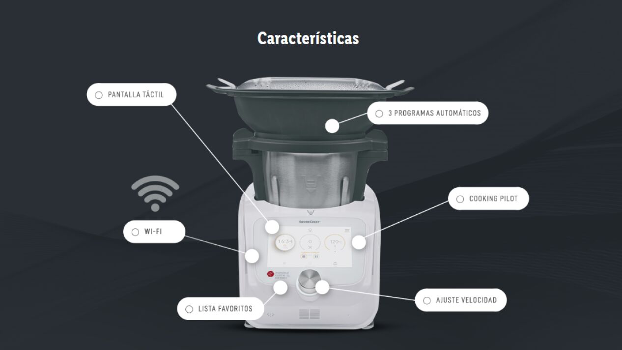 El producto estrella de la cadena de supermercados destaca por tener un vaso de 3,1 litros y una garantía ampliada de hasta tres años. Además ofrece la posibilidad de conectarse a la red WIFI para descargar recetas de forma gratuita y sin necesidad de suscripción, siendo el propio robot el que sigue el paso a paso a través de la pantalla táctil LCD.