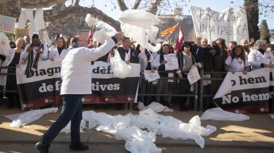Al llegar al Parlament, los médicos han lanzado batas blancas al suelo en señal de protesta, entre silbidos y ruidos de tambores.