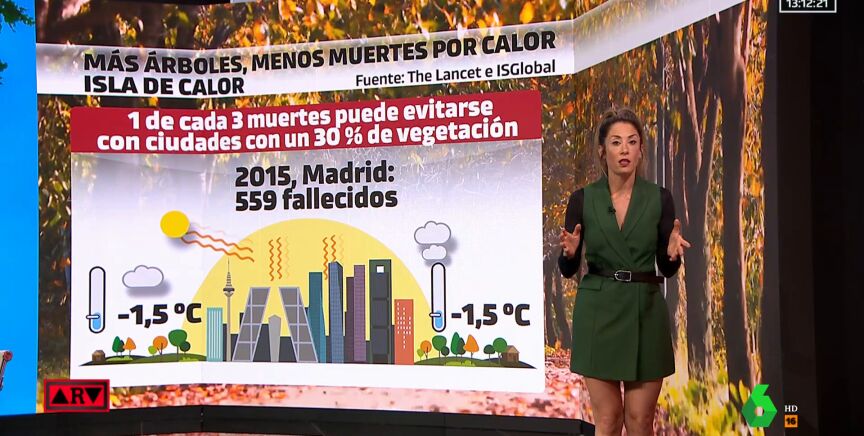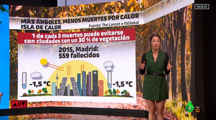 Seis localidades españolas (Barcelona, Málaga, Madrid, Palma, Sevilla y Valencia) están entre las 10 primeras de Europa con más muertes en verano debido al efecto isla de calor urbana, es decir, que hace más calor en la ciudad que en las afueras por materiales absorbentes de calor como el asfalto o los edificios. Un 4,3% de las muertes que se producen en las ciudades durante los meses de verano se deben a las islas de calor urbanas y un tercio de esos fallecimientos podrían evitarse alcanzando una cobertura arbórea del 30%.