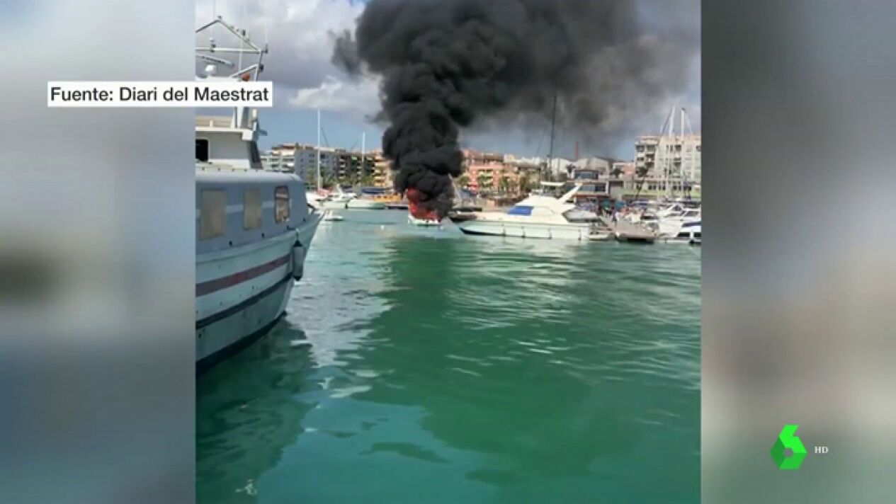Seis personas han resultado heridas tras incendiarse esta embarcación en el Club Náutico de Benicarló, en Castellón. Al parecer, antes de salir a navagar, el barco ha comenzado a arder.