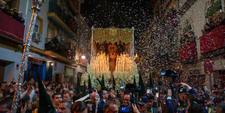 Las seis hermandades de la Madrugá de la Semana Santa de Sevilla ya recorren las calles del centro, componiendo, un año más, ese relato único en el que la ciudad renuncia al sueño para entregarse al fervor, al silencio y a la emoción compartida. La noche avanza entre contrastes: del recogimiento más sobrio a la explosión popular, de la penumbra al brillo de los pasos, de lo íntimo a lo multitudinario.