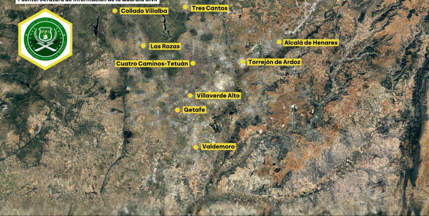 Solo en la Comunidad de Madrid, la Guardia Civil tiene detectadas al menos diez células activas: Tres Cantos, Collado Villalba, Las Rozas, Alcalá de Henares, Cuatro Caminos, Torrejón, Villaverde, Getafe o Valdemoro son algunas de las zonas marcadas en el mapa. También se han desarticulado bloques en Tarragona o el País Vasco.