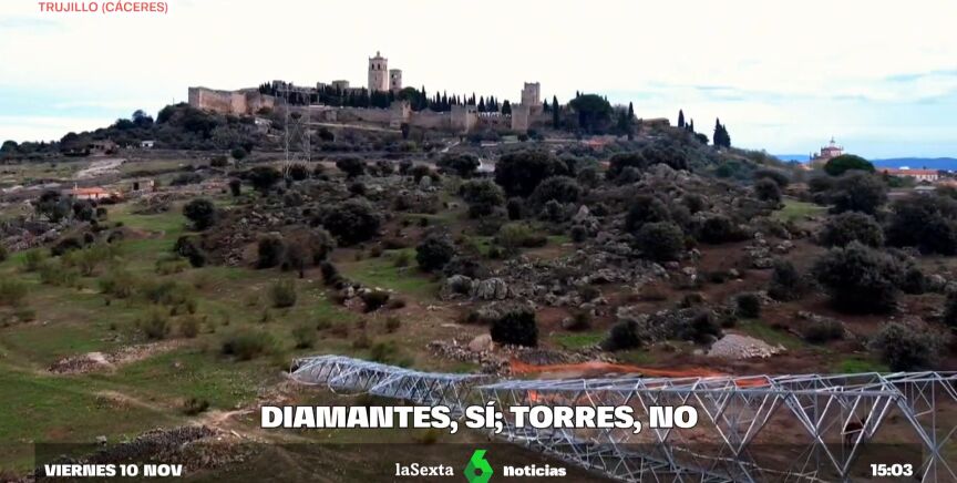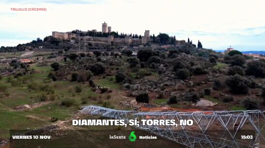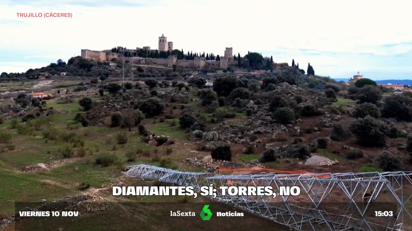 La fábrica de diamantes pretende colocar 22 torres de alta tensión, de 40 metros de altura cada una. Todavía no están colocadas, pero cuando se levanten serían un parapeto para el flanco oeste de la ciudad monumental de Trujillo. Por eso, los vecinos están en pie de guerra y hace dos semanas se concentraron en la puerta del Ayuntamiento como medida de protesta: "Nosotros consideramos que es un atropello, que es un atentado a la ciudad, al paisaje, al berrocal que es una zona protegida", subraya Mateos.