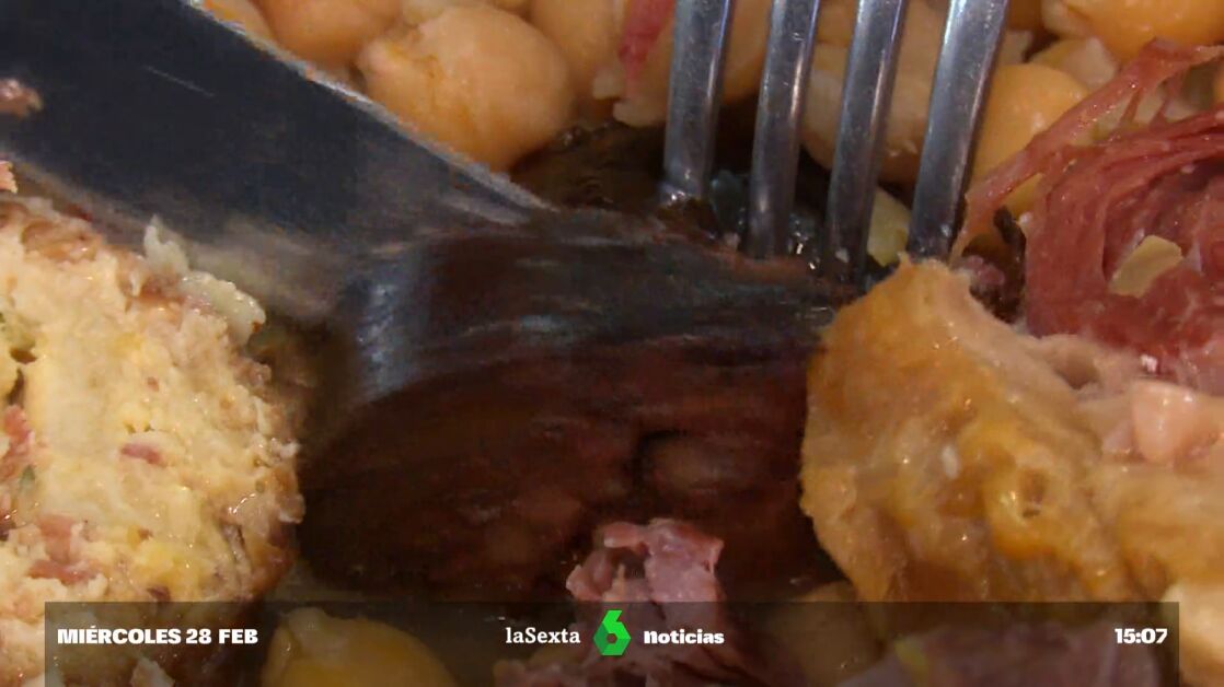 Acto seguido, mete los cocidos en el horno y cada sesenta minutos los da una vuelta y los cambia el agua para que el caldo tenga cada vez más sabor. Cerca de cuatro horas después, los saca, echa el caldo encima de un plato de fideos caramelizados cocidos durante un minuto y, por último, vuelca el resto del puchero en otro recipiente. Para acompañar a la sopa Pepe ofrece cebolla y piparras. También prepara una salsa de tomate para decorar el cocido y lo corona con una suculenta croqueta. "Es tan contundente que solo una persona consiguió comerse este cocido entero, hace siete años. El que lo vuelva a conseguir está invitado", promete el propietario del restaurante Llopis.