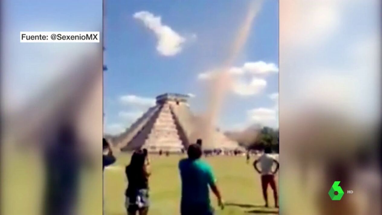 Un gran torbellino sorprende a los turistas en las pirámides de Chichén Itzá