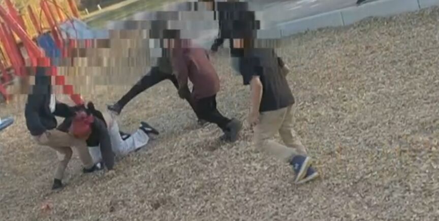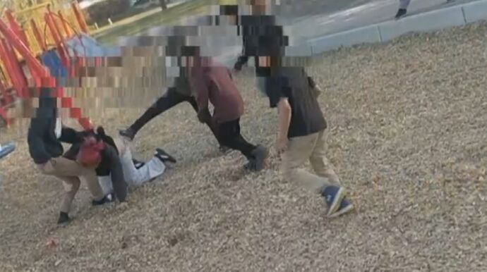 A pesar de que la víctima intenta levantarse, las agresiones no cesan mientras los niños gritan y corren alrededor de ella.