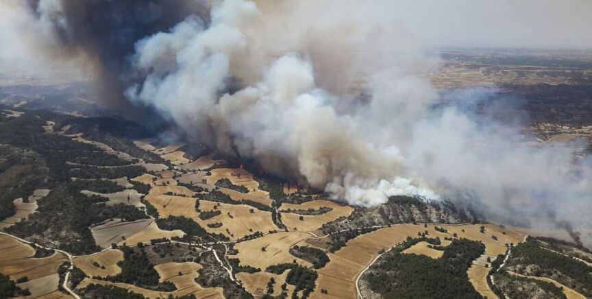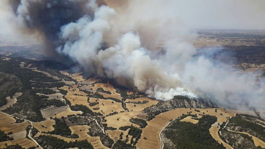Un incendio activo se ha declarado en la sierra de Alcubierre, en la provincia de Zaragoza. Las llamas afectan a más de 1.000 hectáreas entre los términos de Leciñena y Perdiguera.