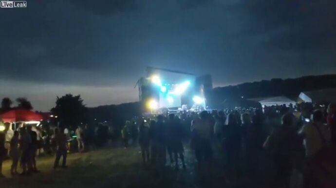 Una fuerte racha de viento provocó que el techo del escenario se cayese, aplastando a parte del público que estaba en primera fila. Además, también salieron volando algunas de las carpas de la zona de chill out.