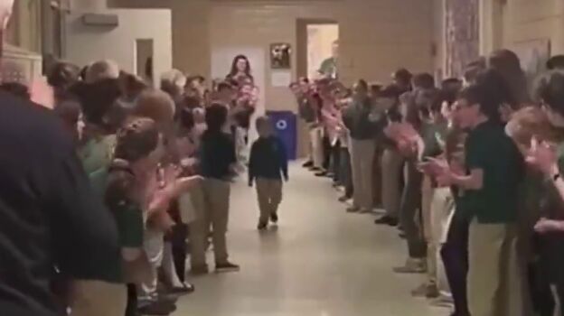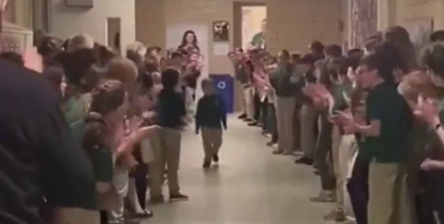El conmovedor vídeo muestra al niño recorriendo el pasillo de su colegio de Ohio, mientras su compañeros le aplauden. John Oliver Zippay, de seis años, había recibido su última sesión de quimioterapia.