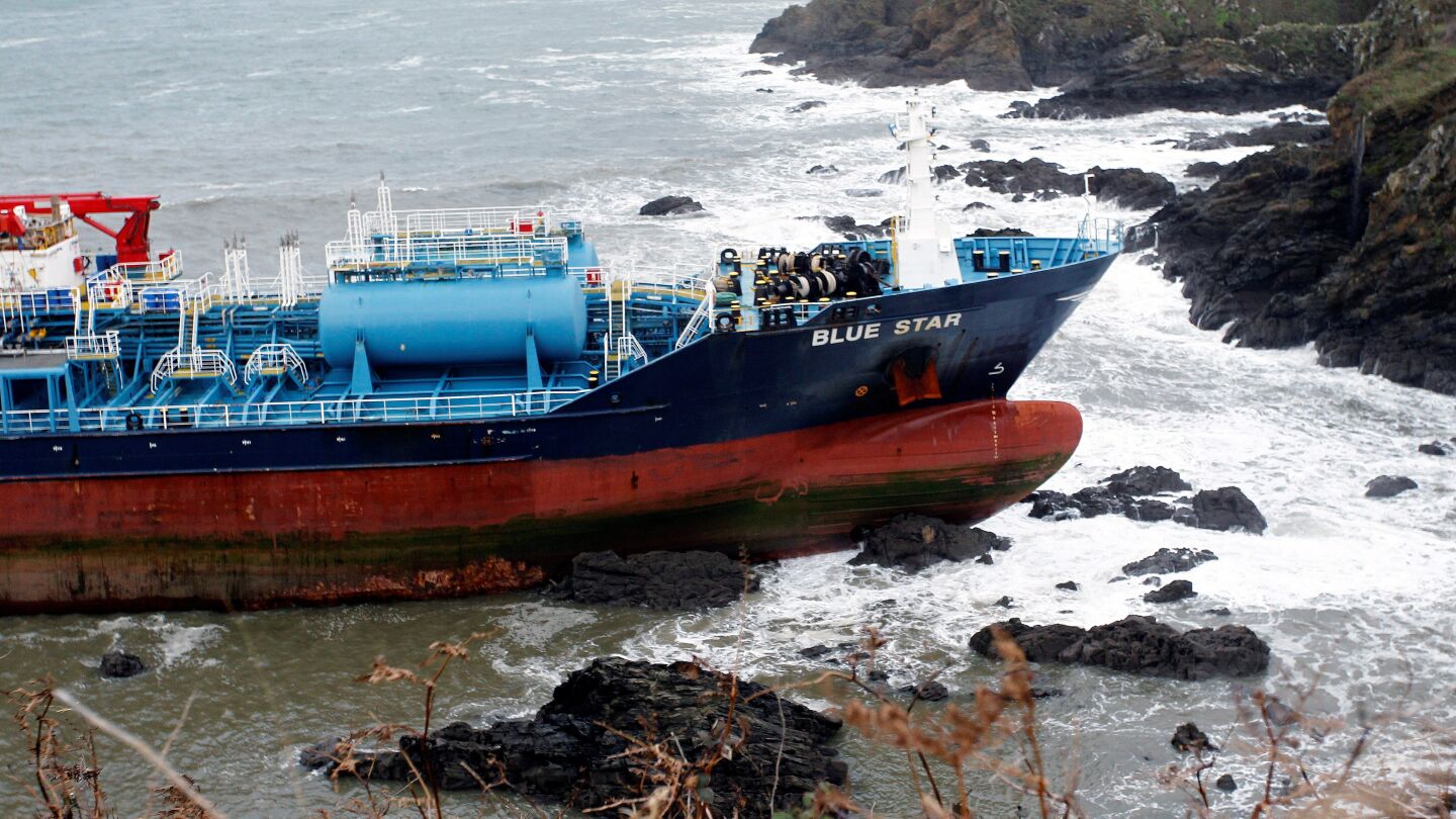 El Blue Star encalló el viernes sobre las once de la noche y en un primer operativo, un helicóptero lanzó los cables para iniciar las maniobras de remolque pero debido al temporal se suspendieron hasta la mañana del sábado. el rescate, también fracasó ya que se partió uno de los cables que tiraban del barco.