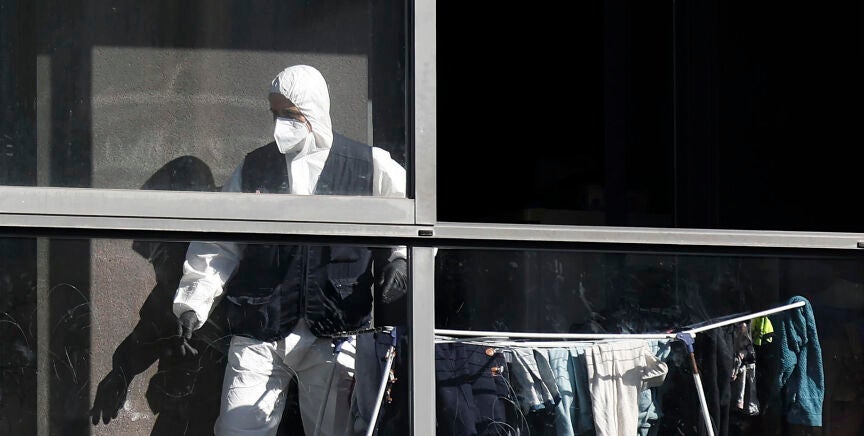 La Policía Científica continúa en el edificio recogiendo pruebas de la escena del crimen en Sarriguren, donde los vecinos están consternados: "Que pasen estas cosas en pleno siglo XXI da mucha pena", ha lamentado una mujer.