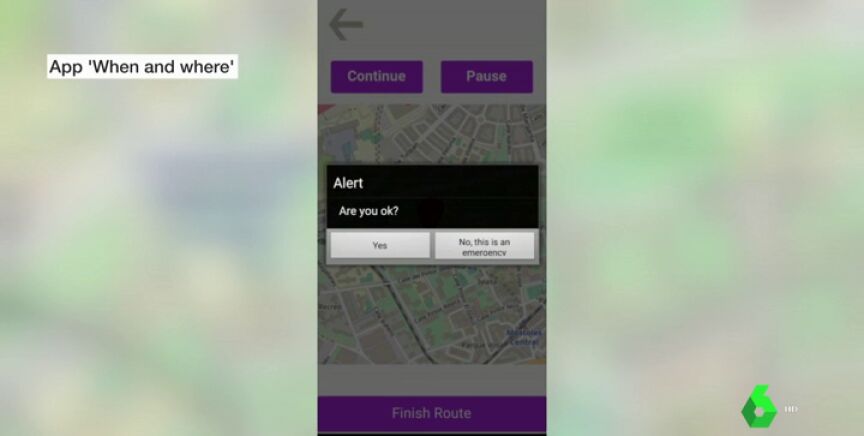 En primer lugar, establecemos un contacto de emergencia y un destino. Una vez iniciado el recorrido, y si la aplicación detecta una anomalía como una detención o un cambio repentino de rumbo, manda automáticamente una alerta con el mensaje "¿Estás bien?".