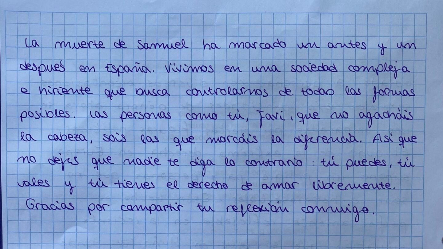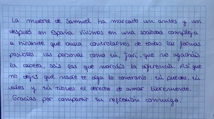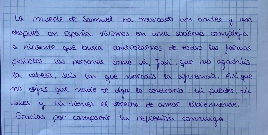 La profesora, que corrigió la redacción, no dudó en dejarle una nota de felicitación por su reflexión sobre la homofobia: "La muerte de Samuel ha marcado un antes y un después en España. Vivimos en una sociedad compleja e hiriente que busca controlarnos de todas las formas posibles. Las personas como tú, Javi, que no agacháis la cabeza, sois las que marcáis la diferencia. Así que no dejes que nadie te diga lo contrario: tú puedes, tú vales y tú tienes el derecho de amar libremente. Gracias por compartir tu reflexión conmigo".