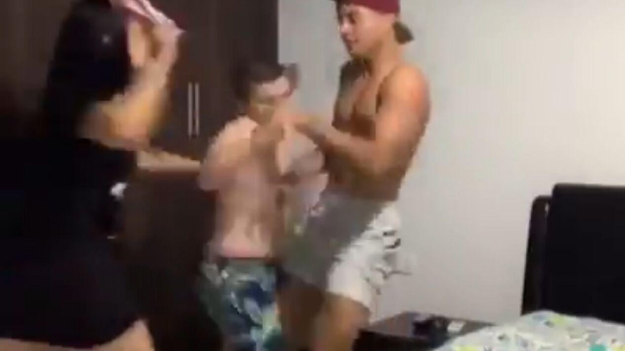 Totalmente cabreada, la mujer no duda en coger su chancla y golpearles con ella hasta en tres ocasiones.