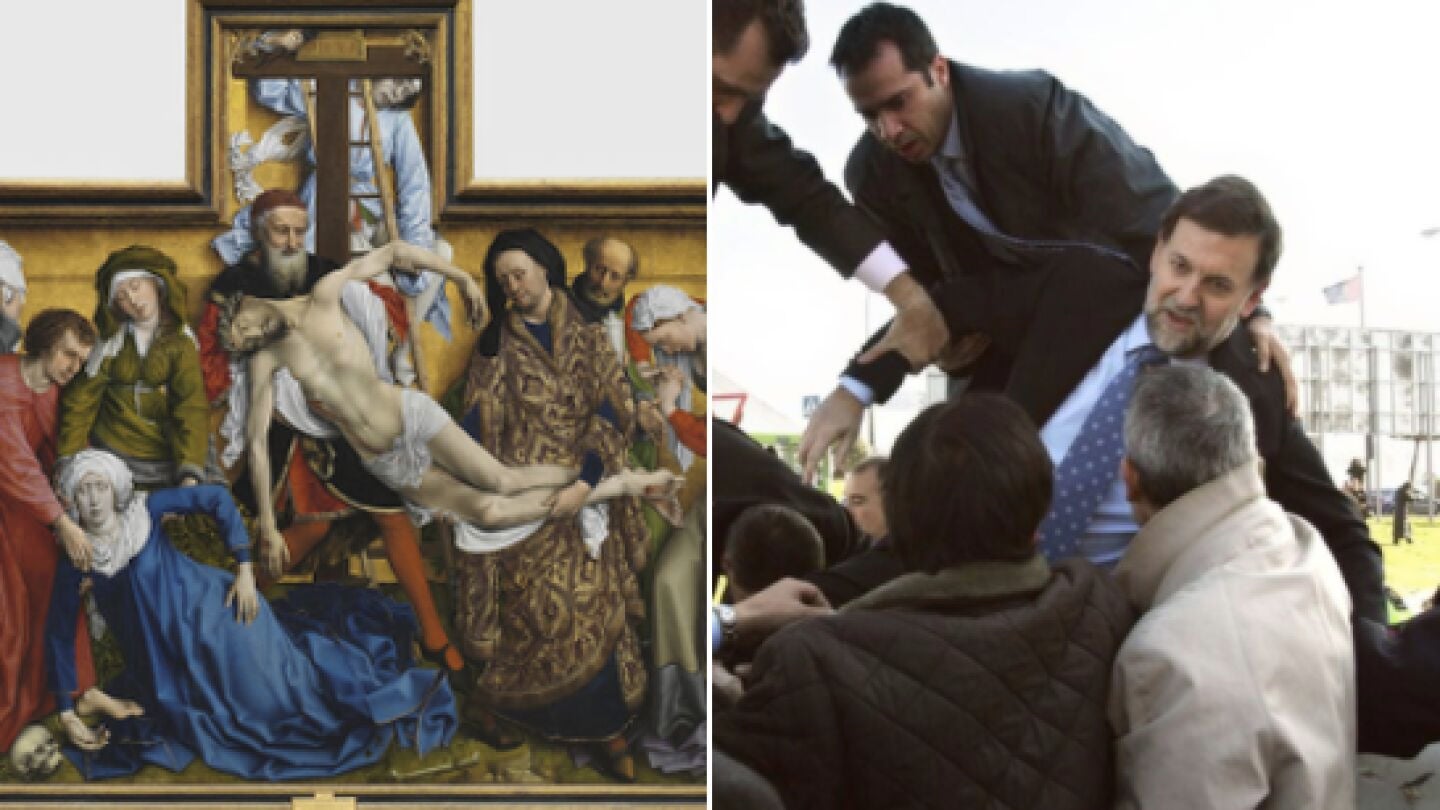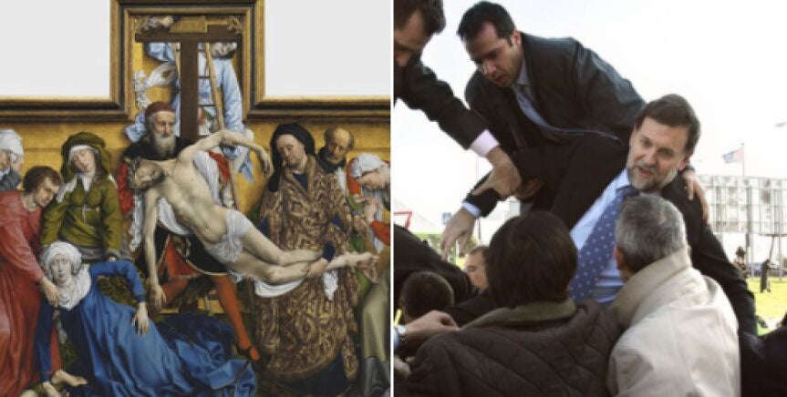 "Hilo de Mariano Rajoy como personaje de cuadros", arranca el original hilo con una fotografía del exlíder del Partido Popular que compara con la obra de Rogier van der Weyden, de 1445, 'Descendimiento de la cruz'. La imagen corresponde al día en el que el expresidente sufrió un accidente de helicóptero en Móstoles junto con Esperanza Aguirre.