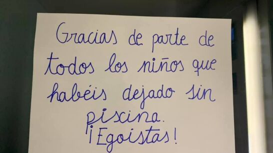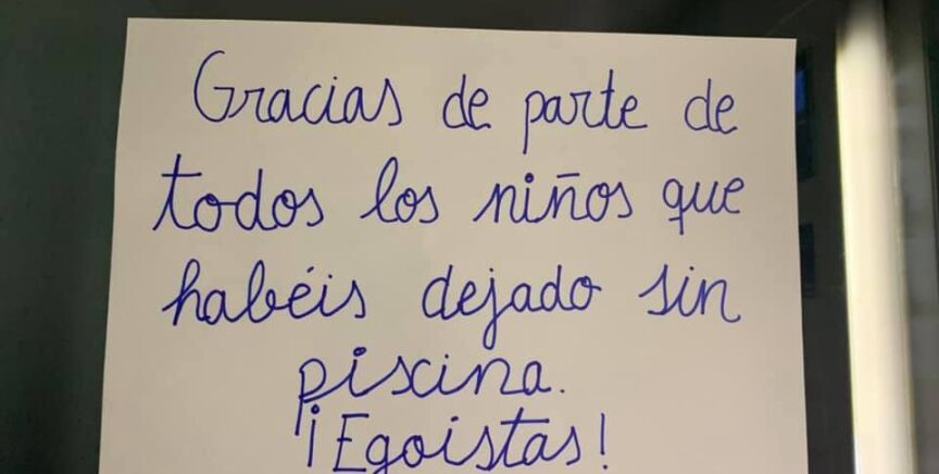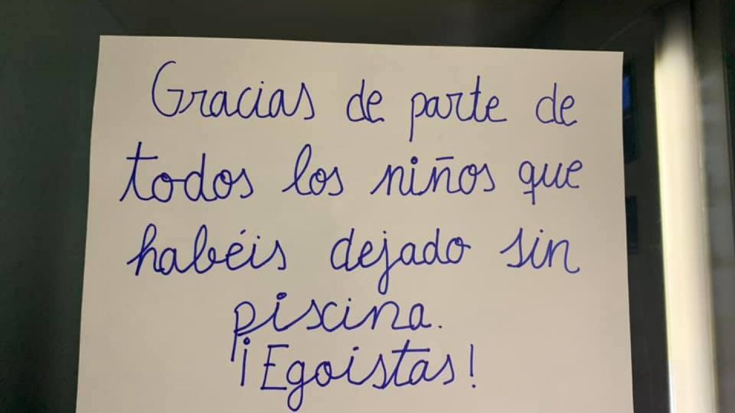 "Gracias de parte de todos los niños que habéis dejado sin piscina. ¡Egoístas!", se puede leer en ese folio. Carmela, al verlo, no pudo evitar hacer una fotografía para publicarla en su perfil de Facebook: "Estoy totalmente de acuerdo con él. Que poca empatía por parte de la mayoría de mis vecinos".