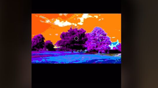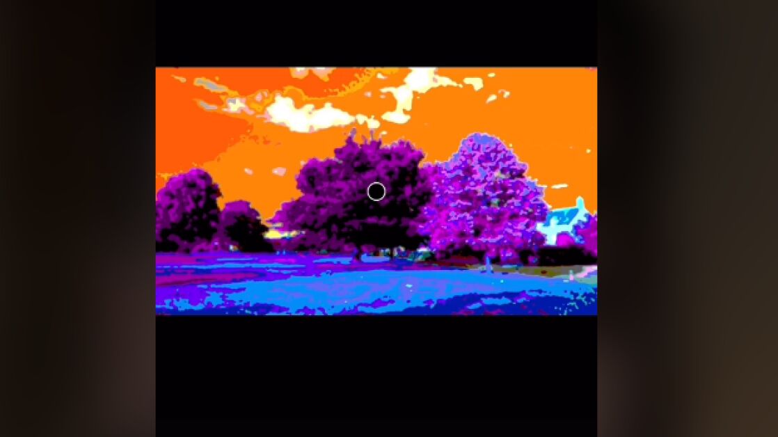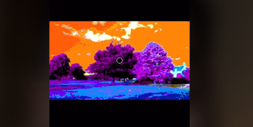Esa imagen muestra un paisaje con césped de color azul, un cielo anaranjado y árboles violetas. En el centro, ese punto rojo que el doctor nos invita a mirar. Después, pasa la imagen a blanco y negro... o eso nos hace creer.