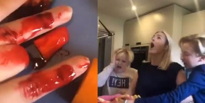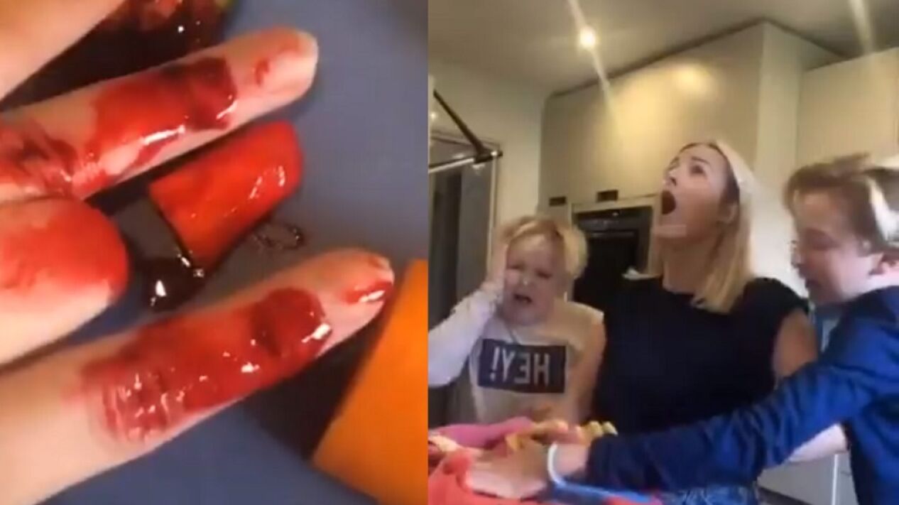 En las imágenes se puede ver cómo la mujer corta la punta de una zanahoria y simula que hay sangre alrededor. En ese momento esta madre grita desesperada 'presa del pánico' y llama a sus hijos. Los pequeños llegan hasta la cocina y se quedan totalmente conmocionados al ver el 'dedo cortado'.