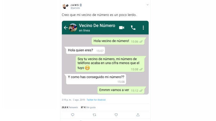 Después se sube una captura de pantalla de la conversación a las redes sociales para compartir la reacción de tu 'vecino' con tus seguidores.