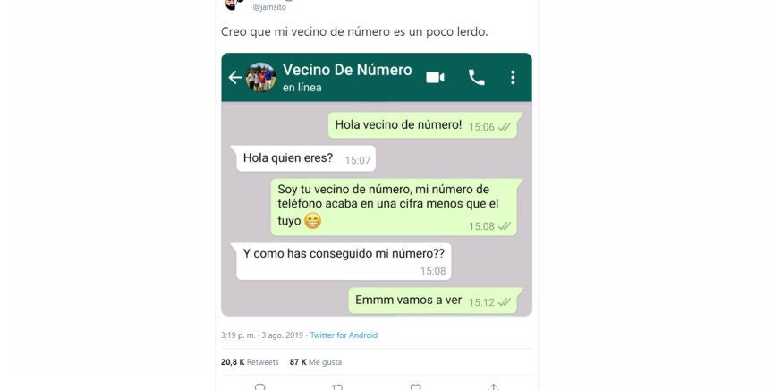 Las redes sociales no serían lo mismo sin retos y Twitter lo demuestra una vez más con un viral: los "vecinos de número". Se trata de contactar a través de Whatsapp o mensaje de texto con tu "vecino de número". Es decir, enviar un mensaje a la persona cuyo número de teléfono coincide con el tuyo excepto en la última cifra, que se debe cambiar por la anterior o la siguiente.