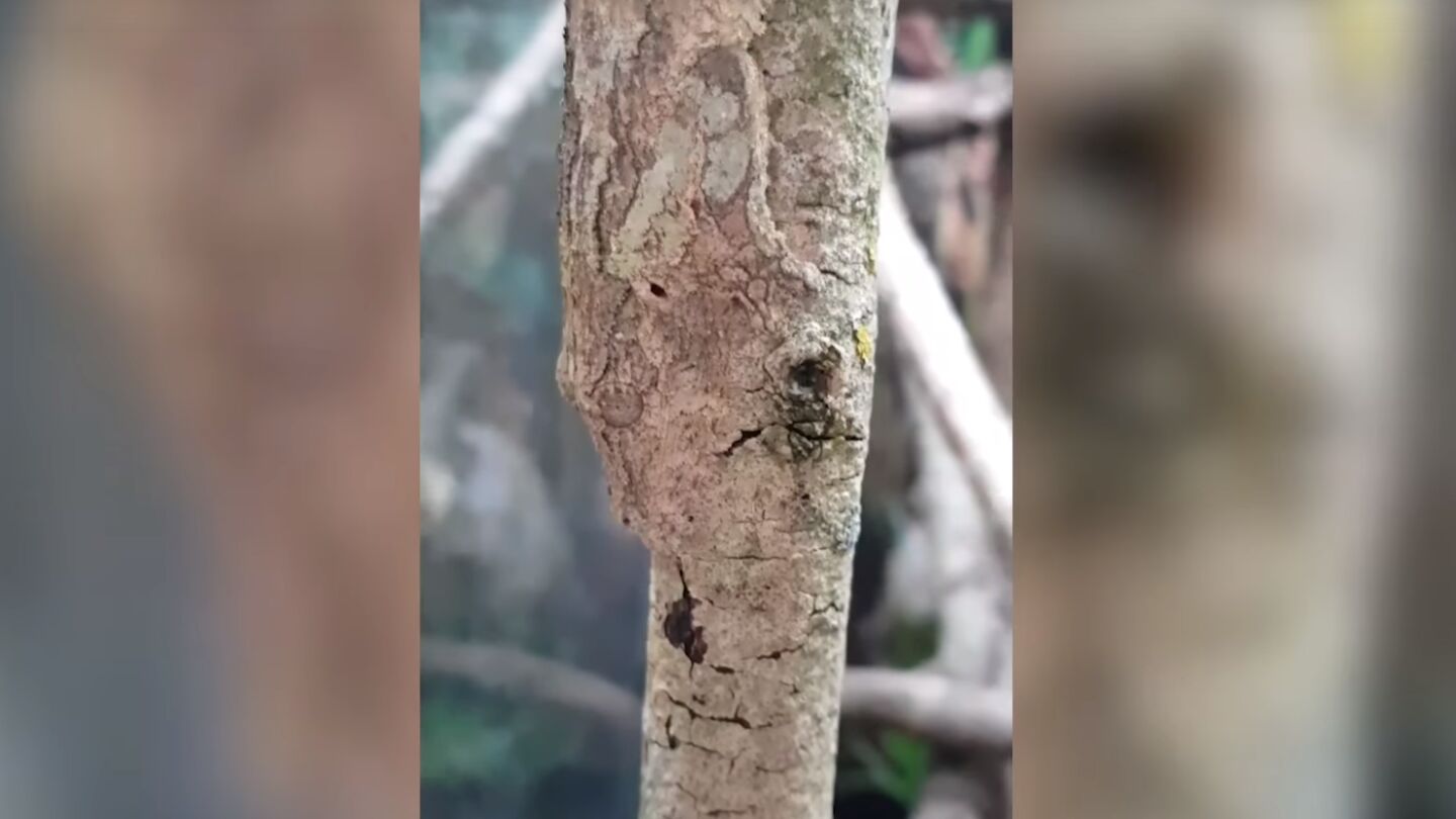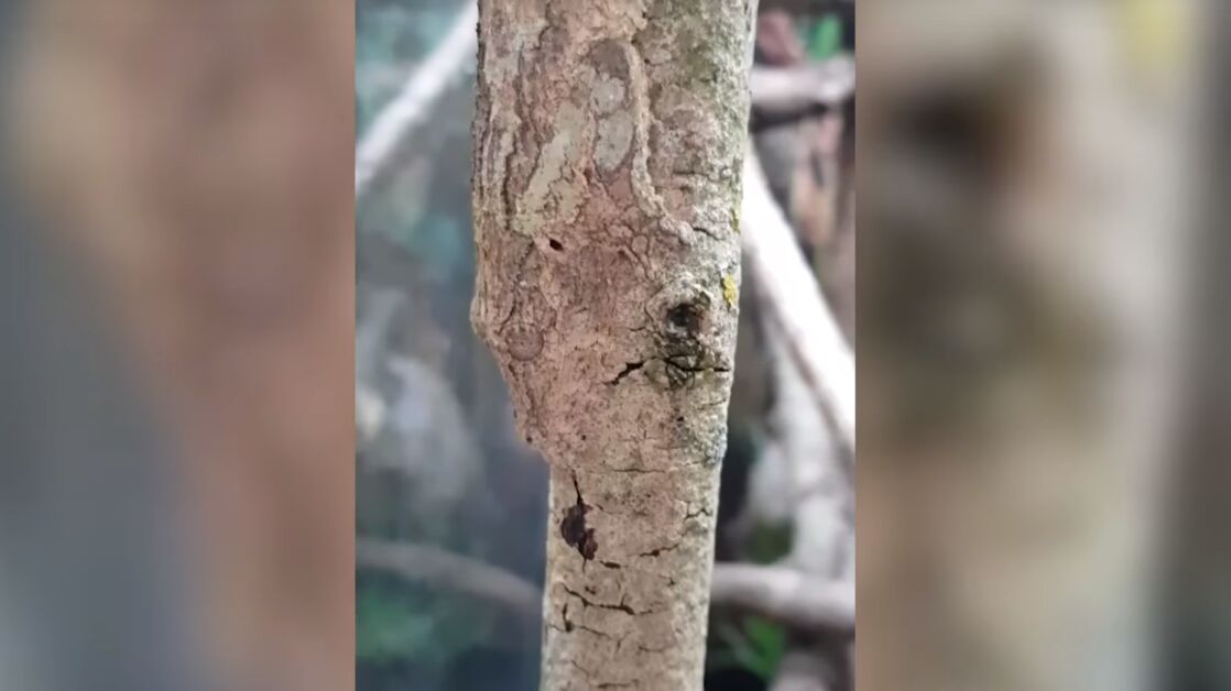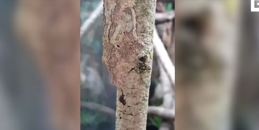 Un vídeo muestra la habilidad de camuflaje de un gecko de cola de hoja escondido en un tronco de un árbol y pone a prueba los reflejos de todo el que lo ve.