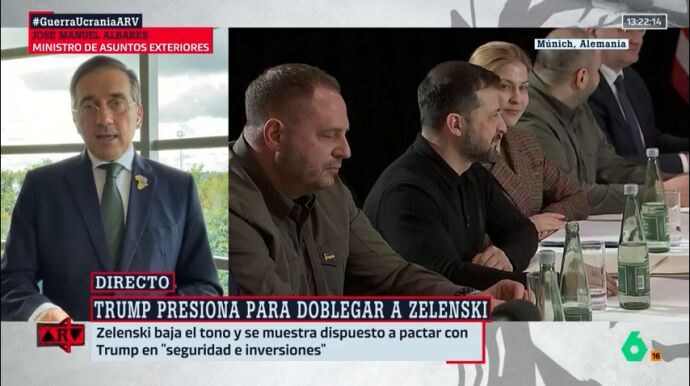 Para Albares, un proceso que no respete a Ucrania puede servir para que "Rusia tome un respiro, se pueda rearmar y en un par de años podamos volver a tener otra guerra de agresión". Es por ello que el ministro se ha mostrado contundente en la posición que adoptará España, que es estar al lado de Ucrania: "Con la cabeza bien fría pero con total firmeza, vamos a seguir sin dar un paso atrás", ha dicho, en respuesta a la pregunta de Antonio García Ferreras, acerca del desafío que afronta Ucrania ante una negociación del fin de la guerra entre EEUU y Rusia que les ha dejado de lado.