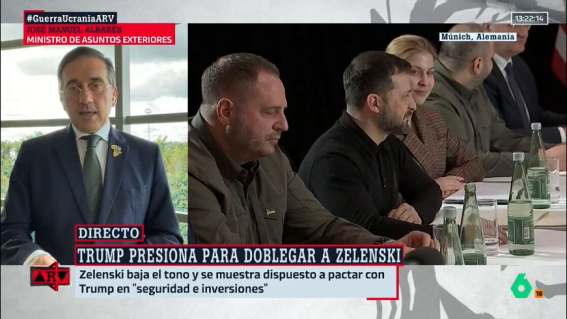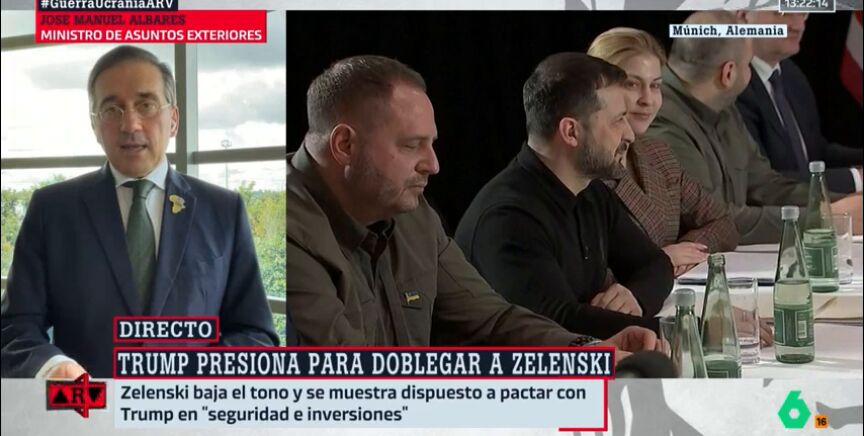 Albares se ha mostrado a favor de "una paz justa y duradera" que, a su juicio, debe "respetar la voluntad del Gobierno democráticamente elegido", en una semana marcada en gran medida por las dudas vertidas por el presidente de Estados Unidos, Donald Trump, sobre la legitimidad de su homólogo ucraniano Volodimir Zelenski, al que ha llegado a tachar de "dictador". En esa línea se ha expresado Albares en directo en Al Rojo Vivo, donde ha defendido que la paz en Ucrania "tiene que ser mucho más que un alto al fuego".