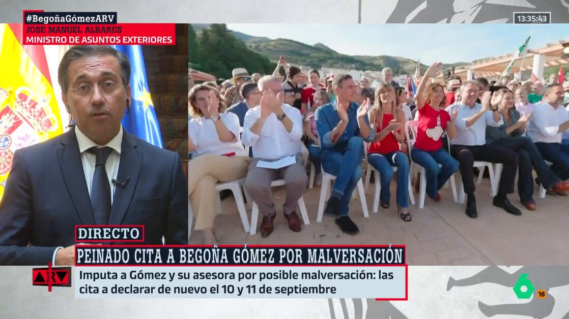 El juez Peinado ha citado a declarar a Begoña Gómez y a su asesora por un presunto delito de malversación de fondos públicos. Un hecho sobre el que José Manuel Albares se ha pronunciado en Al Rojo Vivo.