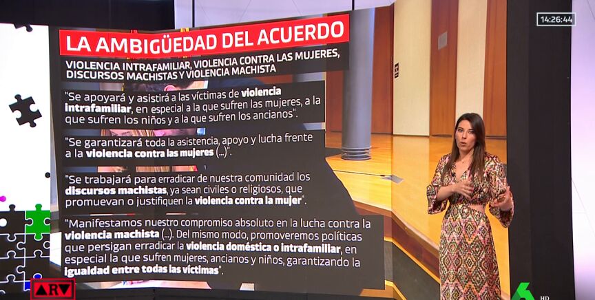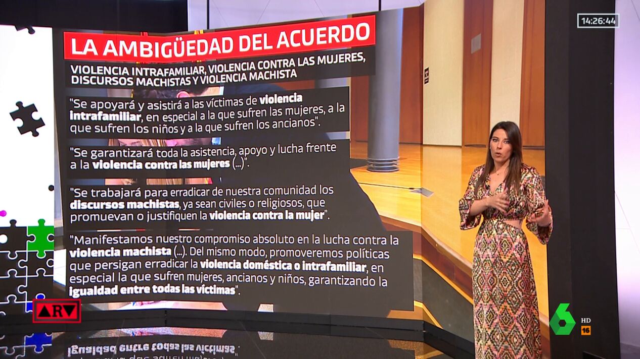 El acuerdo firmado recoge violencia intrafamiliar y violencia doméstica, pero también usa violencia machista o discursos machistas. El PP ha justificado que estos "conceptos no son incompatibles". Asimismo, el documento asume discursos de Vox como el pin parental o la ley trans.