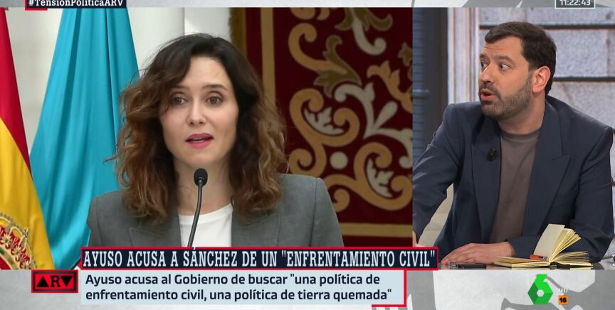 El periodista Antonio Ruiz Valdivia, periodista de InfoLibre, después de escuchar a Isabel Díaz Ayuso, presidenta de la Comunidad de Madrid , decir que "reconocer el Estado palestino como quiere Sánchez es premiar a los terroristas de Hamás" no ha dudado en contestarle. Porque además utiliza palabras como "guerra" al decir que Sánchez de elegir la "guerra" frente a la "concordia".