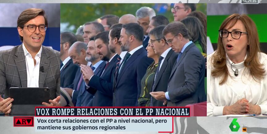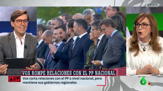 La periodista comenta la reciente noticia en la que hemos podido conocer que Vox ha roto relaciones con la cúpula directiva de Génova. Para la periodista, no obstante, esta "ruptura" es solo "un paripé como la copa de un pino".