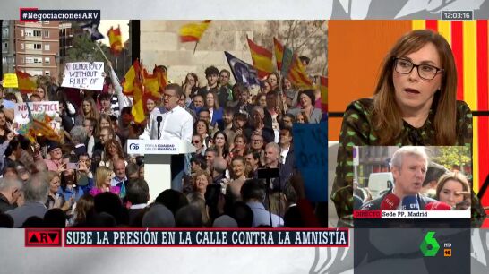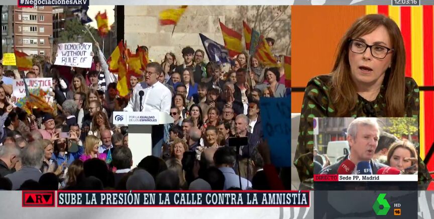 "Lo que no puede ser es que Feijóo 'el moderado' avale, convoque y movilice manifestaciones delante de las sedes del PSOE", zanja la periodista, cuya intervención completa puedes escuchar en el vídeo que ilustra estas líneas.