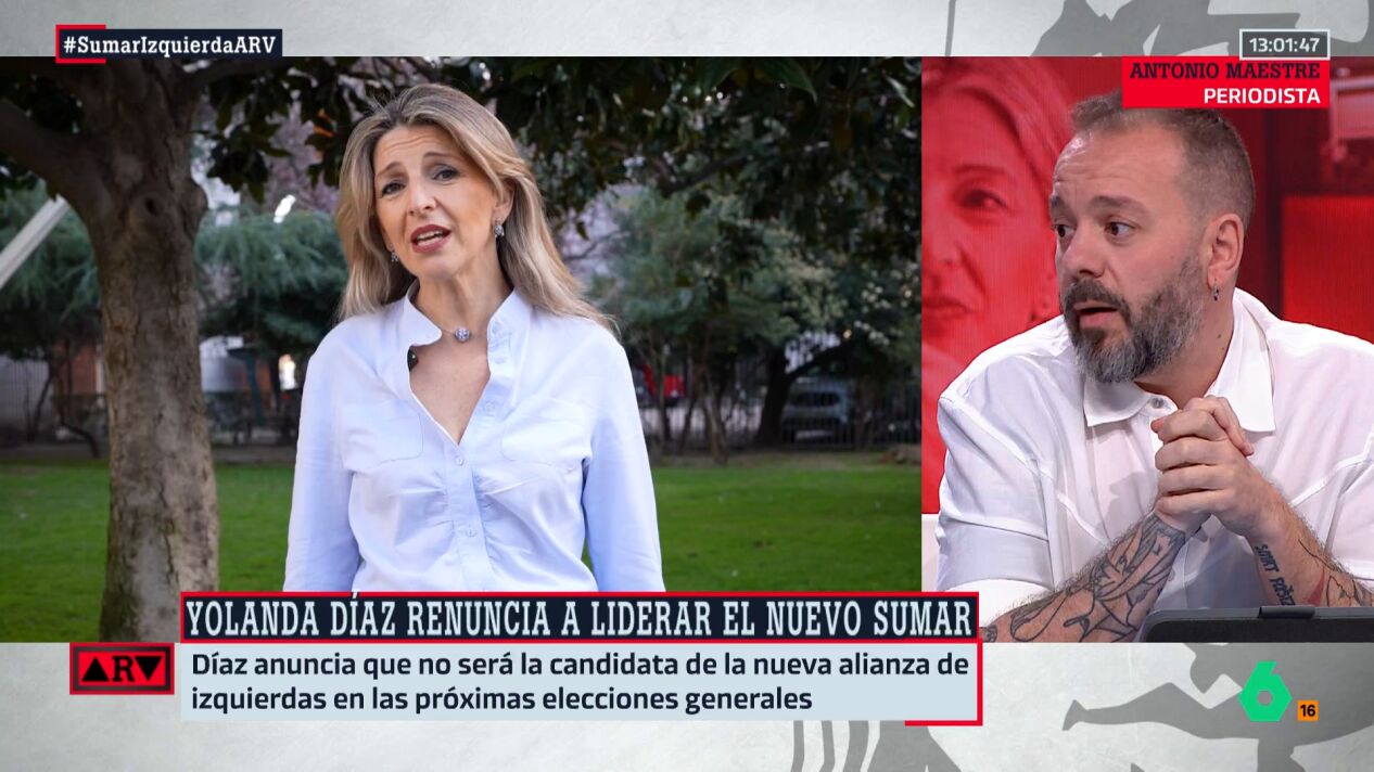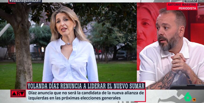 Tras el anuncio de Yolanda Díaz de dejar de liderar el proyecto de Sumar y apartarse de la primera línea política, el periodista y analista de Al Rojo Vivo, Antonio Maestre, ha valorado así su trayectoria: "El legado de Yolanda Díaz es el de una magnífica ministra de Trabajo que no supo liderar el espacio de la izquierda que ella misma contribuyó a organizar".