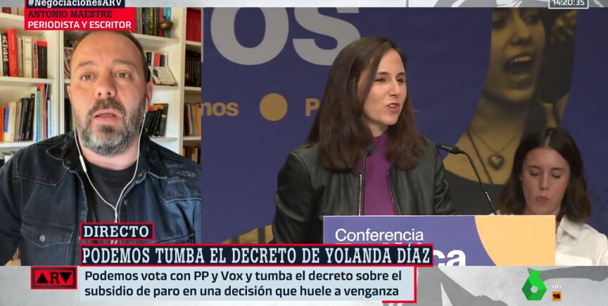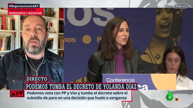 El periodista Antonio Maestre analiza en Al Rojo Vivo el voto en contra de Podemos hacia el decreto impulsado por el ministerio de Yolanda Díaz. Con su voto en contra decae la propuesta de subir la subida del subsidio del desempleo de los 480 a 570 euros mensuales. Tampoco se aplicará el derecho a la universalización del permiso de lactancia hasta 28 días.