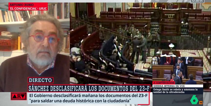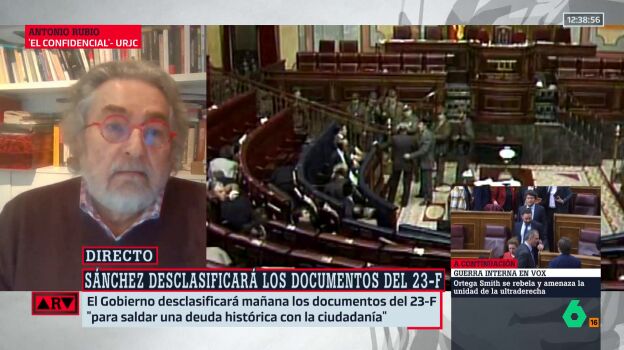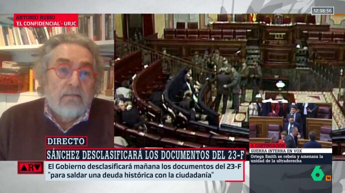 El periodista de investigación Antonio Rubio, ahora en 'El Confidencial', es uno de los periodistas que más conoce lo que pasó en el 23-F y en otros muchos acontecimientos importantes de los primeros pasos de la democracia española. Por eso, tras conocer el anuncio del presidente del Gobierno de que este miércoles se desclasificarán los documentos del 23-F, es claro: "Siempre que no se quede en un aperitivo, me parece bien".