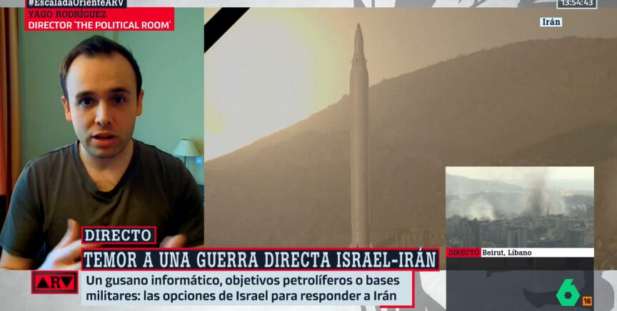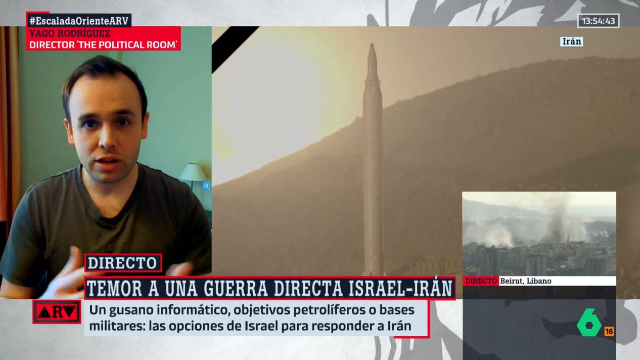 Yago Rodríguez, director de 'The Political Room' responde en Al Rojo Vivo a la pregunta que le formulado Antonio García Ferreras sobre la respuesta que dará Israel a Irán en el conflicto de Oriente Medio. ¿Habrá posibilidad de que ataque Israel el programa nuclear de Irán o se centrará en algo más sencillo como estructura militar?.