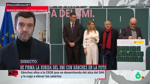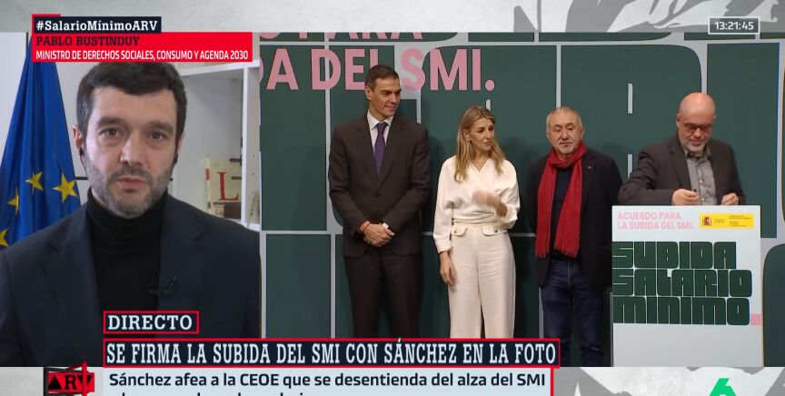 Pablo Bustinduy, ministro de Derechos Sociales, Consumo y Agenda 2030, ha hablado en Al Rojo Vivo sobre la nueva subida del salario mínimo, y ha destacado que "visto en perspectiva", desde su llegada al Gobierno, "es una subida del 66%". "Es un momento importante porque evidencia para qué existe este gobierno y a quién se debe. Es un omento importante y así lo hemos celebrado", ha expresado.