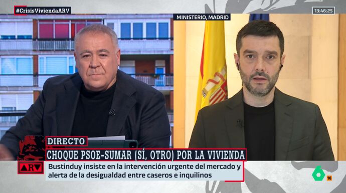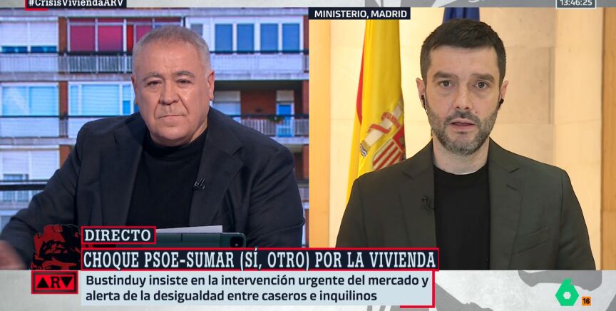 En una entrevista en Al Rojo Vivo, Bustinduy comparte las medidas por las que apuesta Sumar para intervenir el mercado de la vivienda, las cuales evidencian los "modelos diferentes" que defienden Sumar y el PSOE en esta materia. "La política de beneficios fiscales a propietarios se hace desde hace décadas y no ha funcionado", opina el ministro que pide que se lleven a cabo dos medidas concretas: "Prohibir la compra especulativa" de viviendas y poner coto a la "acaparación de viviendas" a través de un impuesto disuasorio a partir de la cuarta vivienda.