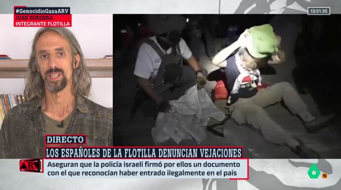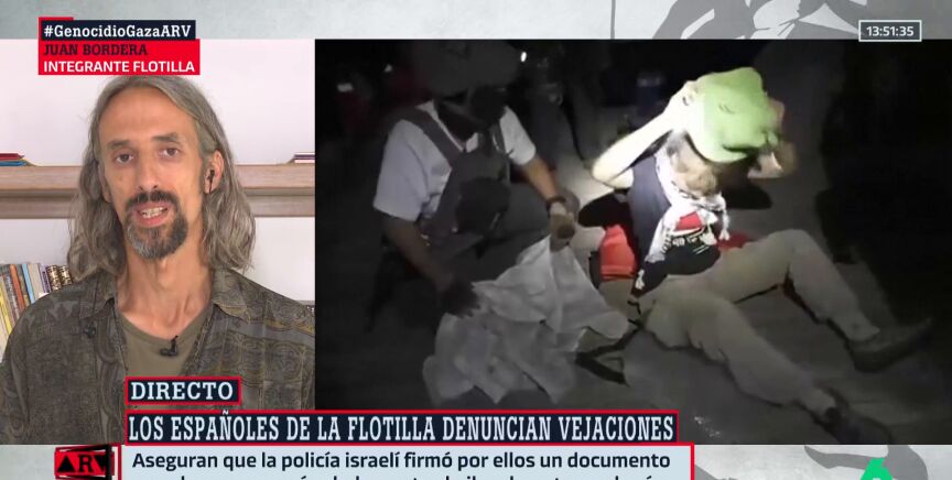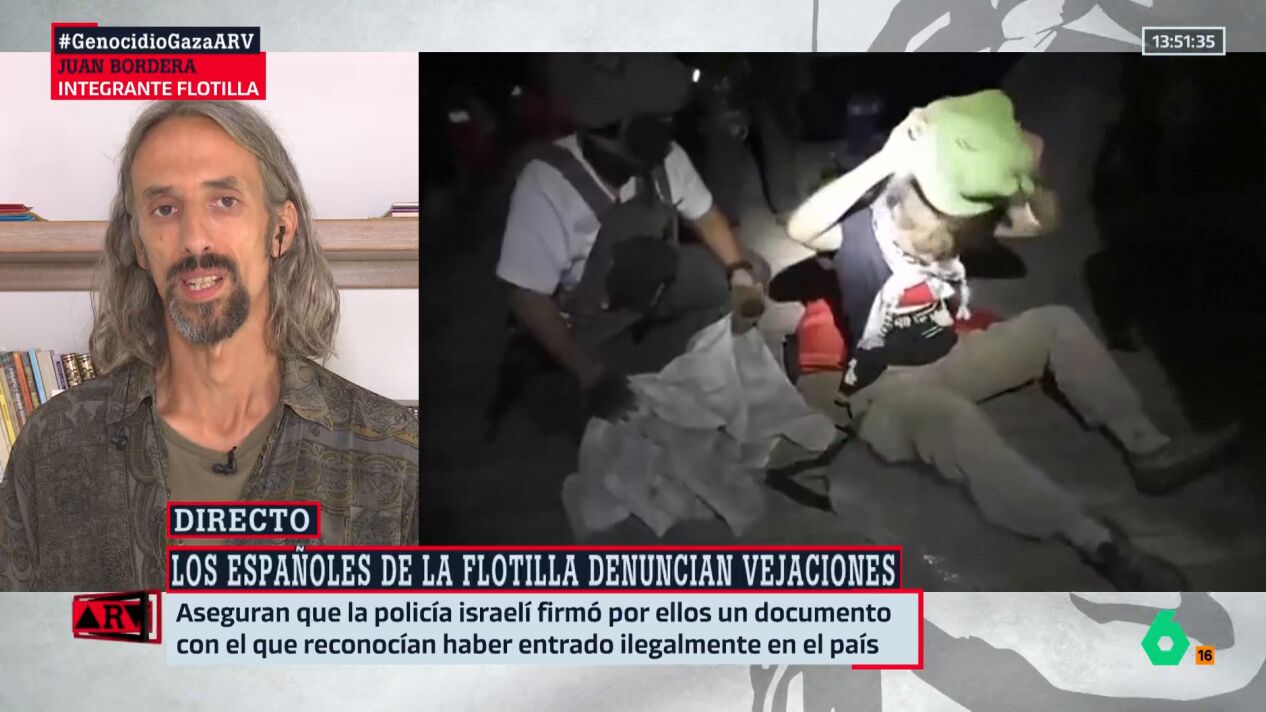 Los miembros de la Flotillaretenidos por Israel y ahora deportados narran un auténtico calvario durante su cautiverio. Juan Bordera, diputado de Compromís y uno de los activistas que iban a bordo de los veleros interceptados cuando llevaban ayuda humanitaria Gaza, destaca en Al Rojo Vivo que, con todo, "esto es algo que pasa día a día en Palestina". "No deberíamos tolerar que esto sea natural, porque no lo es", reclama.