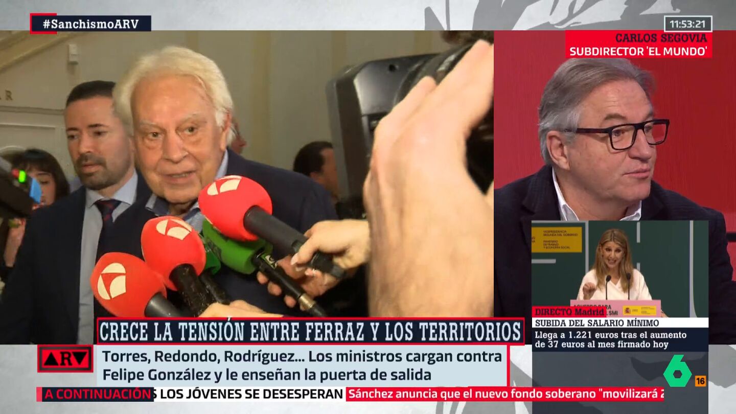 Carlos Segovia, subdirector de 'El Mundo', considera que son "palabras mayores echar a un referente del PSOE y para la política española como Felipe González", por lo que no cree que su partido vaya a hacerlo, aunque ha apostillado que "es verdad que Felipe González ha dicho cosas que por la mitad han expulsado a otras personas del partido", y ha puesto como ejemplo el caso de Nicolás Redondo Terreros.