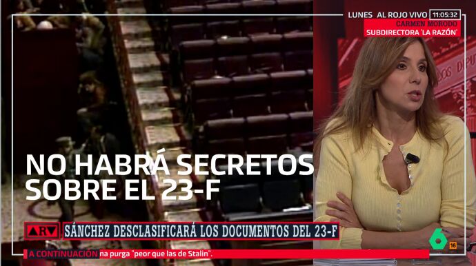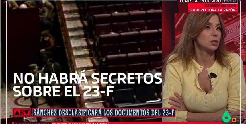 Carmen Morodo, subdirectora de 'La Razón', en Al Rojo Vivo, ha calificado como una "buena noticia" el anuncio de Pedro Sánchez de que el Gobierno desclasificará este martes los documentos del intento de golpe de Estado del 23-F, con el objetivo de "saldar una deuda histórica con la ciudadanía".