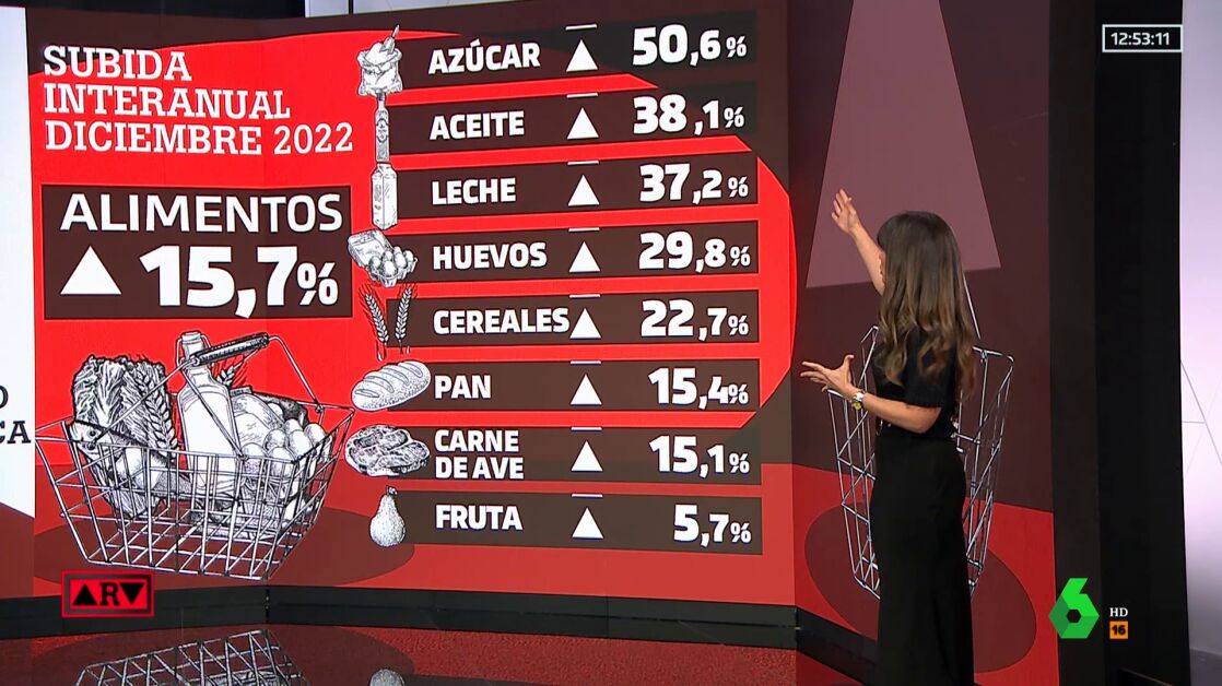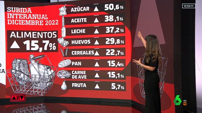 Los alimentos han subido un 15,7% durante 2022. No existen registros tan elevados en la serie histórica, que comenzó en el año 1994. Los mayores incrementos se han dado en alimentos básicos encabezados por el azúcar, que se ha disparado más de un 50%.